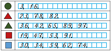 1) Не заполняя полностью таблица числами от 1 до 100, запиши числа, закрытые фигурами.