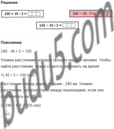 35. Два человека находились на расстоянии 240 м друг от друга. Первый человек пошёл по направлению ко второму со скоростью 45 м/мин, а второй остался на месте. Каким будет расстояние между ними через 3 мин?