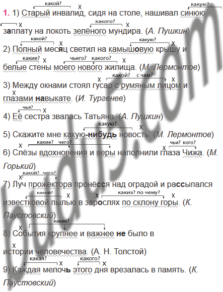 1) Старый инвалид сидя на столе нашивал синюю з..плату на локоть зелёного мундира. (А. Пушкин) 2) Полный мес..ц светил на камыш..вую крышу и белые стены моего нового жилища. (М. Лермонтов) 3) Между окнами стоял гусар с румяным лицом и глазами (на)выкате. (И. Тургенев) 4) Её сестра звалась Татьяна. (А. Пушкин) 5) Скажите мне какую(нибудь) новость. (М. Лермонтов) 6) Слёзы вдохновения и веры наполнили глаза Чижа. (М. Горький) 7) Луч прожектора пронё..я над оградой и ра(с, сс)ыпался извес(?)ковой пылью в зар..слях по склону горы. (К. Паустовский) 8) События крупнее и важнее (не)было в истории человечества. (А. Н. Толстой) 9) Каждая мелоч(?) этого дня врезалась в память. (К. Паустовский) 10) Весь день мы бродили по этому городу красных скал кошек и стариков б..седу..щих около выт..щ..(н, нн)ых на берег, подпёртых извес(?)ковыми глыбами шхун. (К. Паустовский)