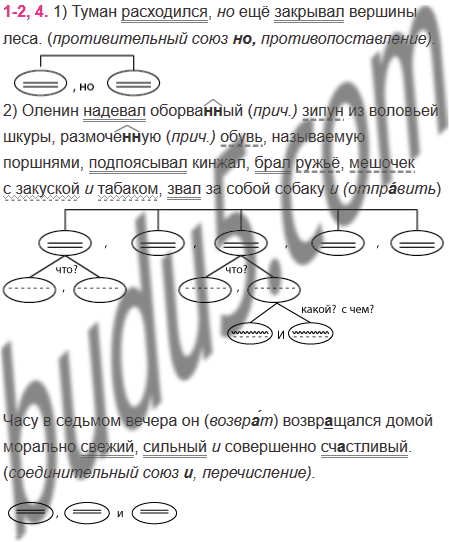 1) Туман расходился но ещё закрывал вершины леса. 2) Оленин надевал оборва..ый зипун из воловьей шкуры размоче..ую обувь называемую поршнями подпоясывал кинжал брал ружьё мешочек с закуской и табаком звал за собой собаку и отпр..влялся часу в шестом утра в лес за станицу. Часу в седьмом вечера он возвр..щался домой морально свежий сильный и совершенно сч..стливый. Он не мог бы сказать, о чём он думал всё это время. Не то мысли не то воспоминания не то мечты бродили в его голове...