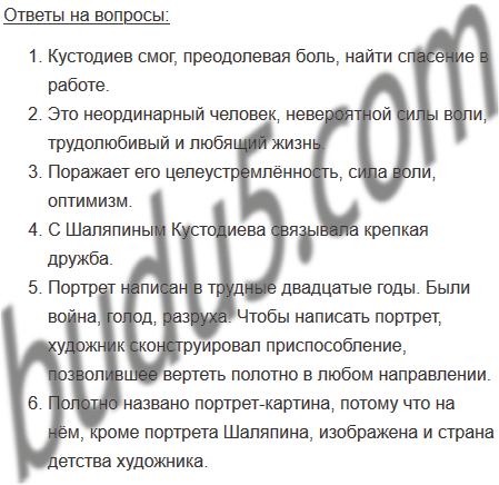 Портрет Фёдора Ивановича Шаляпина — одна из лучших картин известного русского художника Бориса Михайловича Кустодиева (1878—1927). Из 130 изображений артиста в живописи и скульптуре этот портрет, по мнению Ф. И. Шаляпина, самый удачный. Внимательно рассмотрите портрет-картину (см. цветную вклейку, с. 10—11) и прочитайте фрагменты из очерка В. Липатова. Первый фрагмент — о художнике и его картине. Составьте тезисный план текста. Ответьте на вопросы: