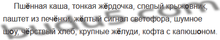Пш..нная каша, тонкая ж..рдочка, спелый крыж..вник, паштет из печ..нки, ж..лтый сигнал светофора, шумное ш..у, ч..рствый хлеб, крупные ж..луди, кофта с капюш..ном.