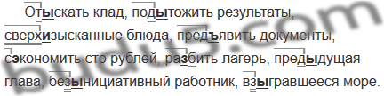От..скать клад, под..тожить результаты, сверх..зысканные блюда, пред..явить документы, с..экономить сто рублей, ра..бить лагерь, пред..дущая глава, без..нициативный работник, вз..гравшееся море.