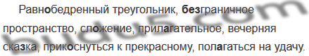 Равн..бедренный треугольник, (без)граничное пространство, сл..жение, прил..гательное, вечерняя ска..ка, прик..снуться к прекрасному, пол..гаться на удачу.
