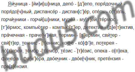 Яичница, депо, порядочный, диспансер, отель, горчичники, музей, термос, компьютер, детектив, прачечная, термин, свитер, теннис, кофе, лотерея, тембр, тезис, опека, фанера, двоечник, претензия.