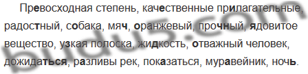 Пр..восходная степень, кач..ственные пр..лагательные, радос(?)ный, с..бака, мяч(?), ..ранжевый, проч(?)ный, ..довитое вещество, у..кая полоска, жи..кость, ..тважный человек, дожидат(?)ся, р..зливы рек, пок..заться, мур..вейник, ноч(?).