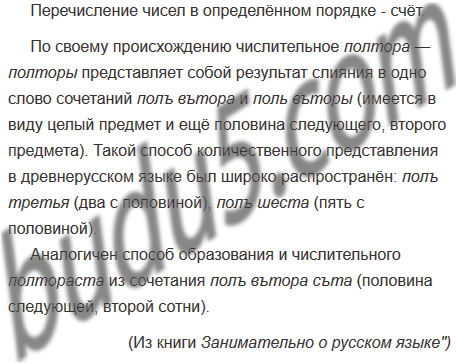 Аналогичен способ образования и числительного полтораста из сочетания полъ вътора съта (половина следующей, второй сотни).
