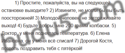 1) Мужик, ты на следующей остановке выходишь? 2) Женщина, не толкайтесь, вы не одна в автобусе! 3) Эй ты, в очках, выход не загораживай! 4) Продавец, мне 200 грамм колбаски. 5) Гражданин врач, температура у меня поднялась. 6) А он у меня всё списал! 7) Дорогой ты мой, глубокоуважаемый приятель Костя, позволь поздравить тебя с пятёркой!