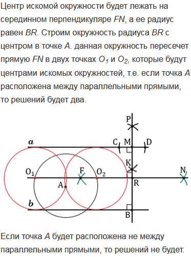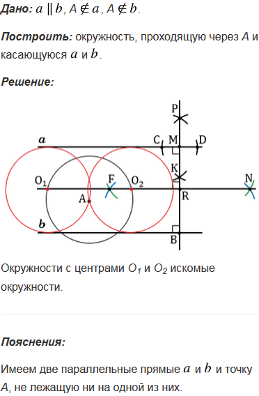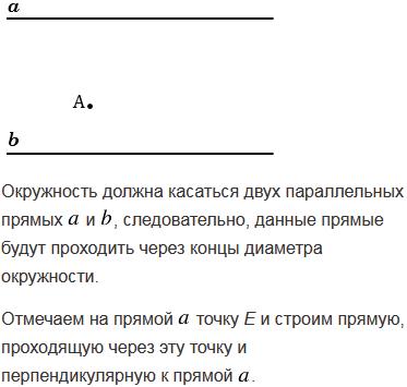 Даны две параллельные прямые и точка, не лежащая ни на одной из них. Постройте окружность, проходящую через данную точку и касающуюся данных прямых.